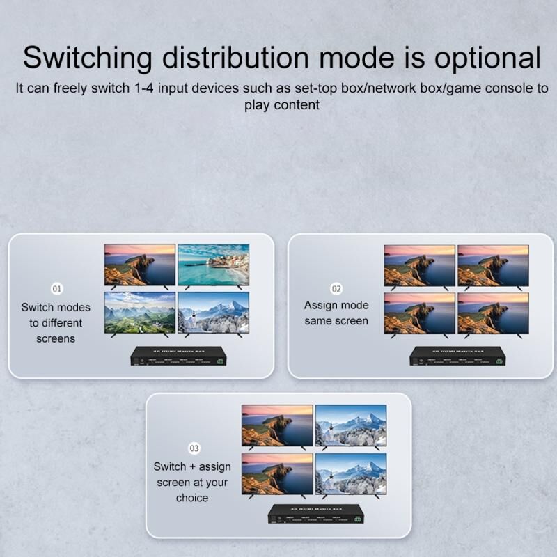 This HDMI 4K 30Hz matrix 4x2 can connect 4 HD display signal sources with 2 HD signals at the same time, and can support optical fiber and stereo headphone output. It can freely switch or distribute 4 HD signals on 2 HD-compatible monitors or projectors. The HDMI Out1 output port can realize independent audio output through optical fiber or stereo headphones. HDMI 4K 30Hz matrix 4x2 reorganizes and amplifies the input signal and transmits it losslessly through HDMI cables. The solution provided by this HDMI matrix is applied to entertainment centers, retail and websites, HDTVs, set-top disks, DVDs, projectors, data center control, information distribution, conference rooms, schools and corporate training environments for digital HDTV programs.
