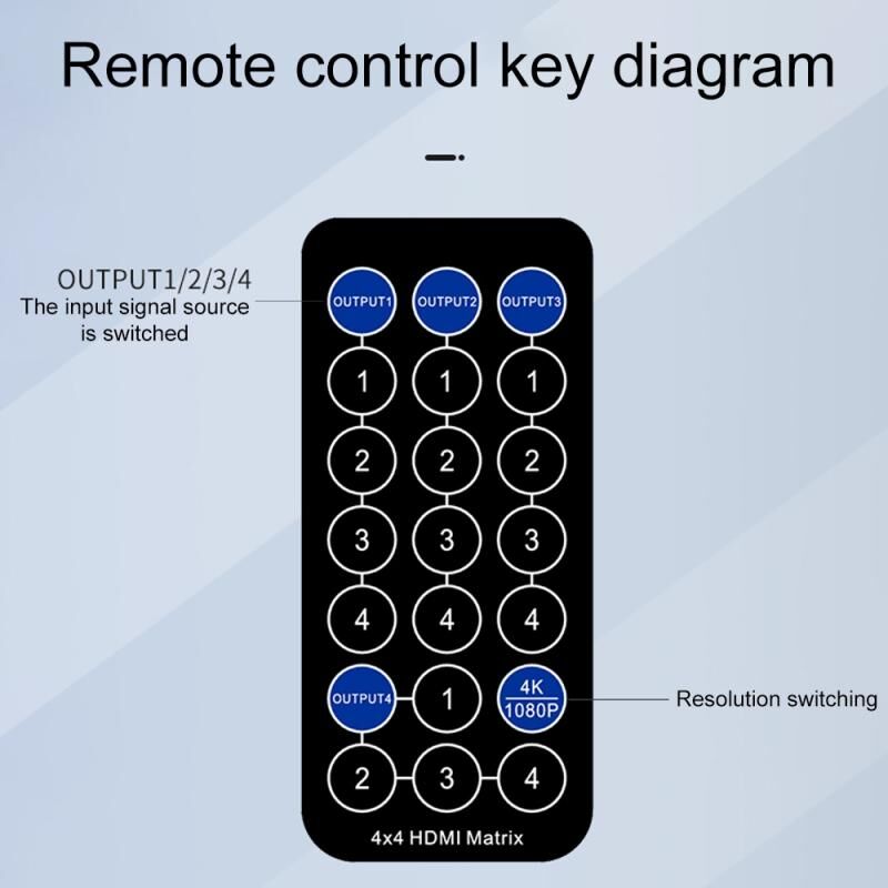 This HDMI 4K 30Hz matrix 4x4 can connect 4 HD display signal sources with 4 HD signals at the same time, and can support optical fiber and stereo headphone output. It can freely switch or distribute 4 HD signals on 4 HD signal compatible monitors or projectors. The HDMI Out1 output port can realize independent audio output through optical fiber or stereo headphones. HDMI 4K 30Hz matrix 4x4 reorganizes and amplifies the input signal and transmits it losslessly through HDMI cable. The solution provided by this HDMI matrix is applied to entertainment centers, retail and websites, HDTVs, set-top disks, DVDs, projectors, data center control, information distribution, conference rooms, schools and corporate training environments for digital HDTV programs.