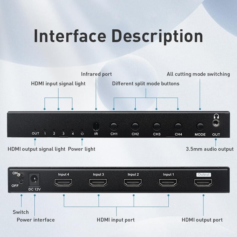 1. Multiple split modes: full-screen mode, dual-screen mode, picture-out-picture mode, four-split mode, and four scene split modes to choose from.