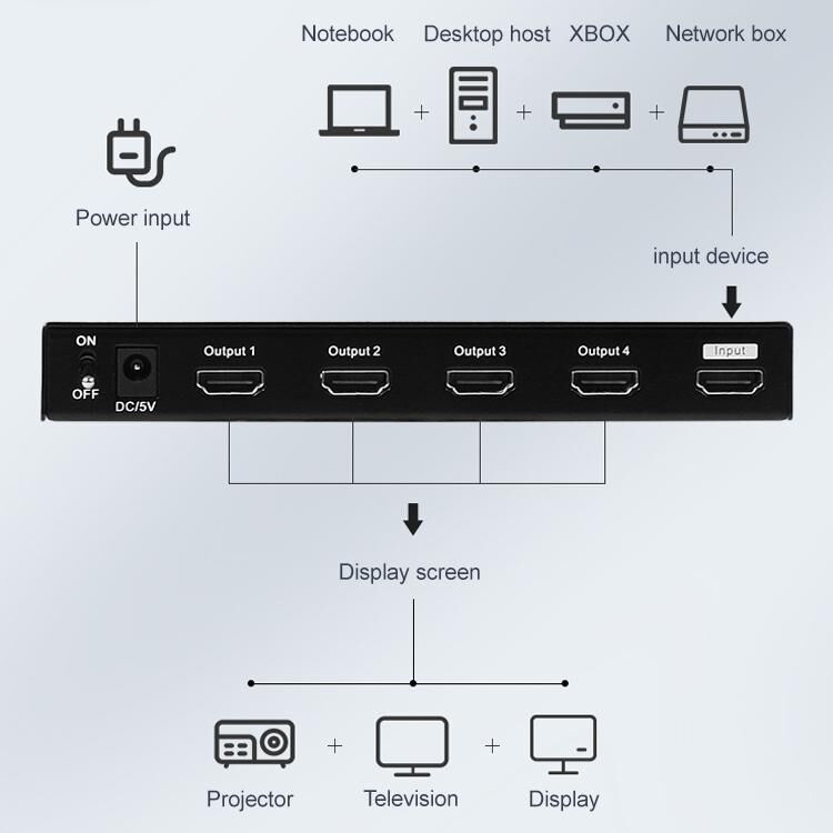 1. It can connect 4 TVs, projectors and other devices with HDMI interface at the same time.