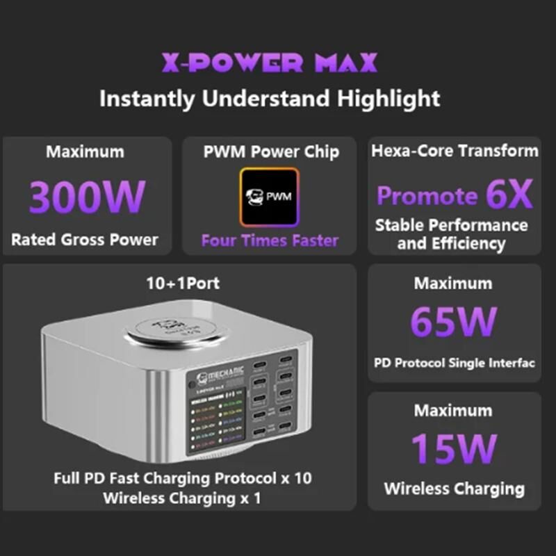 Σταθμός Φόρτισης USB με Ψηφιακή Οθόνη, Πολλαπλές Θύρες και Ασύρματη Φόρτιση, Σειρά Mechanic X-Power, Συνολική Ισχύς: 300W (Ευρωπαϊκό Βύσμα) (MECHANIC)