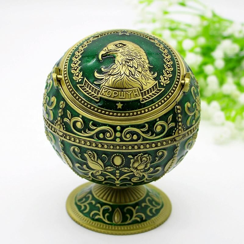 Metal Globe Ashtray With Lid Holiday Gift Tea Table Decoration(Ancient Copper Green Eagle)