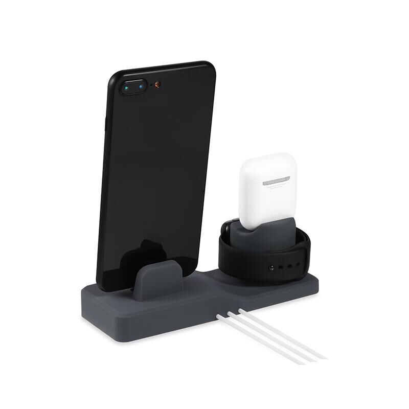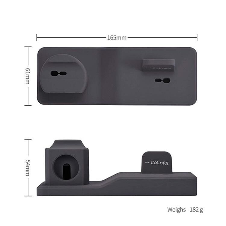 1. Υλικό: Σιλικόνη 2. Βάρος: 182γρ 3. Διαστάσεις: 16,5 x 6,1 x 5,8εκ 4. Χαρακτηριστικά: γρήγορη εγκατάσταση, εύκολη φόρτιση, ασφαλές αναδιπλούμενο, αυτοκόλλητο καλωδίου 5. Σκοπός: αποθήκευση εξοπλισμού, τακτοποιημένο γραφείο, εύκολη φόρτιση 6. Κατάλληλο για iPhone/AirPods/iWatch 7. Το προϊόν περιλαμβάνει μόνο τη βάση, όχι άλλα προϊόντα