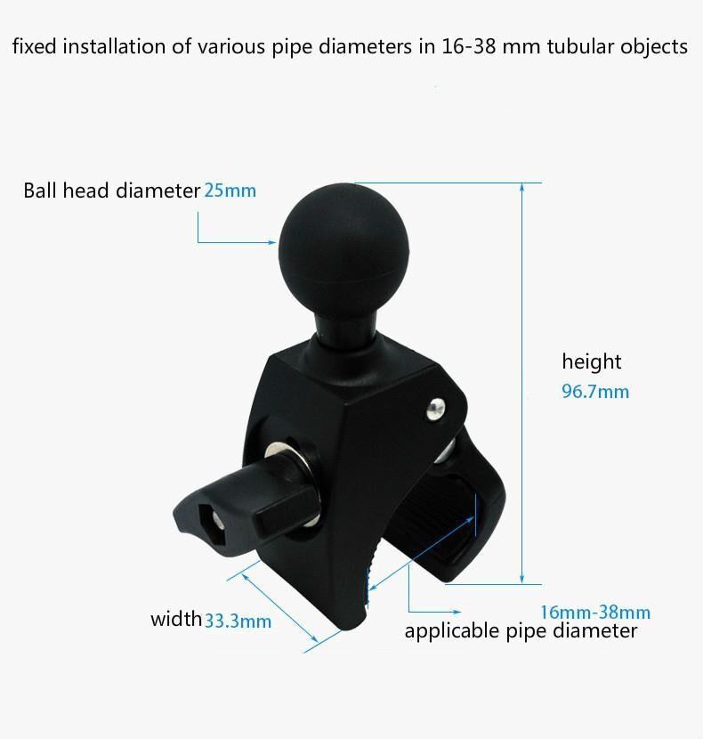 2. Size: ball head diameter 25mm, height 96.7mm, width 33.3mm, applicable pipe diameter 16-38mm