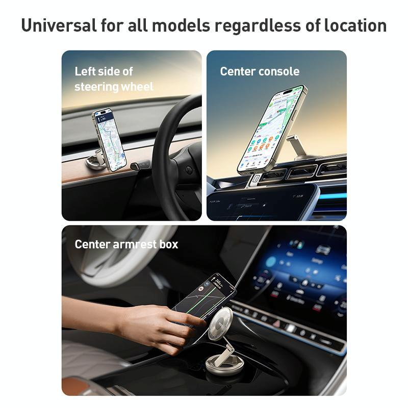 5. Universal Compatibility: Suitable for various car models and mounting locations, including the left side of the steering wheel, behind the screen, on the center console, or near air vents. Its compatible with iPhone 12-16 series (direct attachment) and other phone models (using the included metal plate).