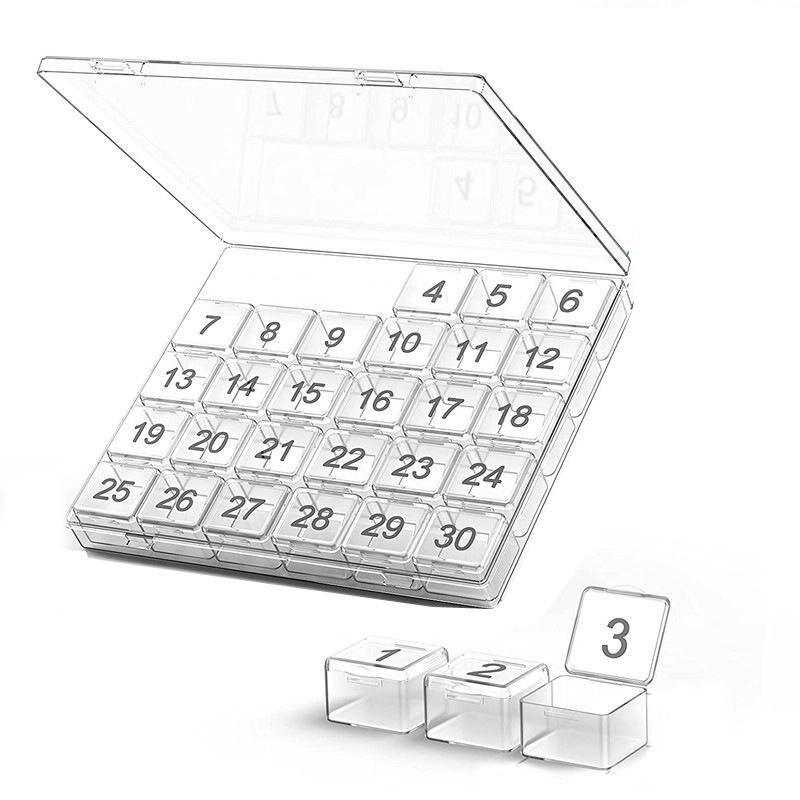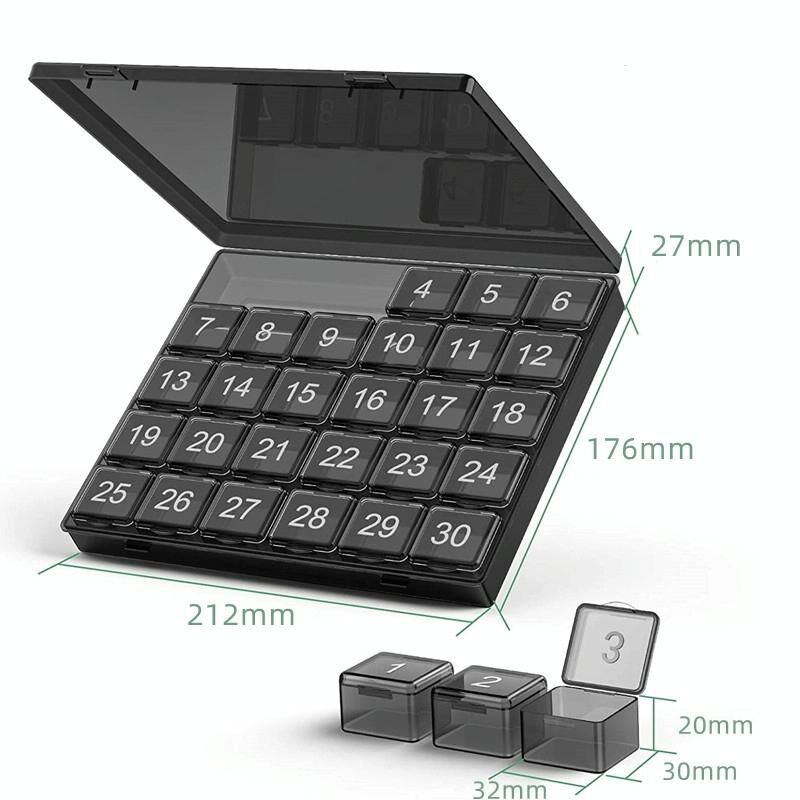 1. The pill box has 30 independent small pill boxes with a total size of 21.2 x 18 x 2.7cm and a single compartment size of 3.4 x 3.2 x 2.4cm