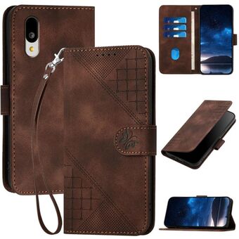 For Fujitsu Arrows F-52B Grid Butterfly Embossed Pattern Flip Leather Phone Case with Lanyard(Coffee)