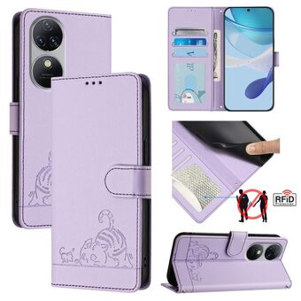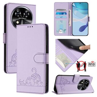 For Oukitel C38 Cat Rat Embossed Pattern RFID Leather Phone Case with Lanyard(Purple)