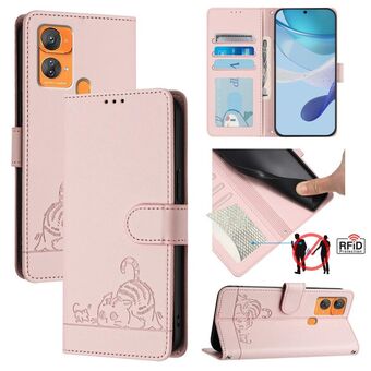 For Oukitel C33 Cat Rat Embossed Pattern RFID Leather Phone Case with Lanyard(Pink)
