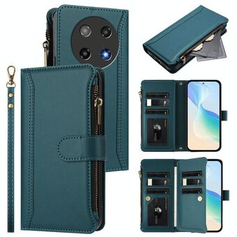 For Coolpad X100 Magnetic Closure 9 Card Slots Zipper Leather Case with Hand Strap(Dark Green)