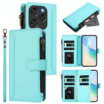 For Coolpad C16 Magnetic Closure 9 Card Slots Zipper Leather Case with Hand Strap(Turquoise)