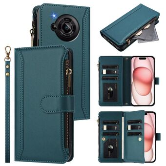 For Sharp Aquos R7 Magnetic Closure 9 Card Slots Zipper Leather Case with Hand Strap(Turquoise)