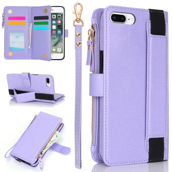 For iPhone 8 Plus / 7 Plus Wristband Holder Zipper Purse RFID Leather Phone Case(Purple)