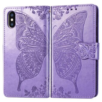 Θήκη δέρματος οριζόντιας αναδίπλωσης για iPhone X με ανάγλυφο σχέδιο πεταλούδας, λουλουδιών, βάση στήριξης, θήκες καρτών, πορτοφόλι και λουρί (Σκούρο Μωβ)