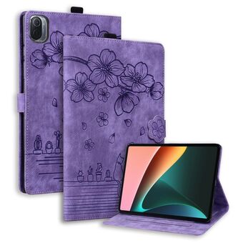For Xiaomi Pad 5 / 5 Pro Cartoon Sakura Cat Embossed Leather Tablet Case(Purple)