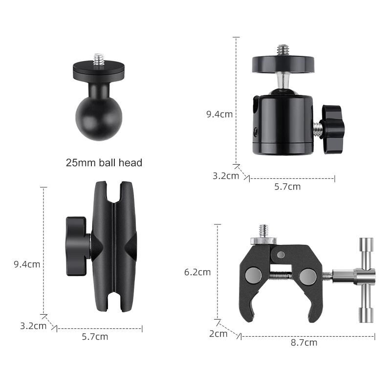 4. Η βάση έχει μια οπή βίδας 1/4, η οποία μπορεί να συνδεθεί με ένα τριγωνικό κλιπ ή μια προέκταση ράβδου, και η κορυφή είναι μια βίδα 1/4, η οποία μπορεί να συνδεθεί με μια κάμερα, κλιπ κινητού τηλεφώνου ή προσαρμογέα, κ.λπ.·