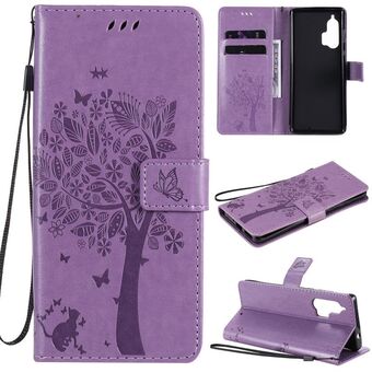 For Motorola Edge+ Tree & Cat Pattern Pressed Printing Horizontal Flip PU Leather Case with Holder & Card Slots & Wallet & Lanyard(Light Purple)