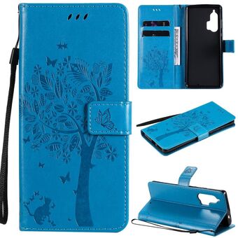 For Motorola Edge+ Tree & Cat Pattern Pressed Printing Horizontal Flip PU Leather Case with Holder & Card Slots & Wallet & Lanyard(Blue)