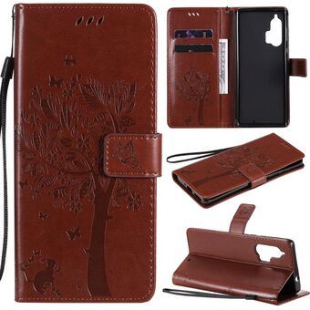 For Motorola Edge+ Tree & Cat Pattern Pressed Printing Horizontal Flip PU Leather Case with Holder & Card Slots & Wallet & Lanyard(Brown)