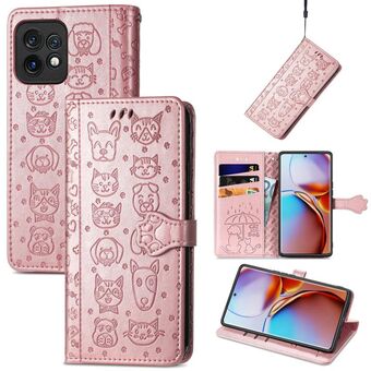 For Motorola Moto X40 Cute Cat and Dog Embossed Flip Leather Phone Case(Rose Gold)