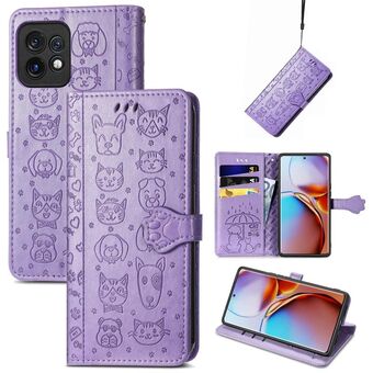 For Motorola Moto X40 Cute Cat and Dog Embossed Flip Leather Phone Case(Purple)