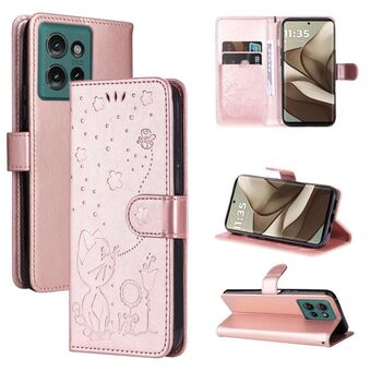 For Motorola Edge 50 5G Cat and Bee Embossed Flip Leather Phone Case(Rose Gold)