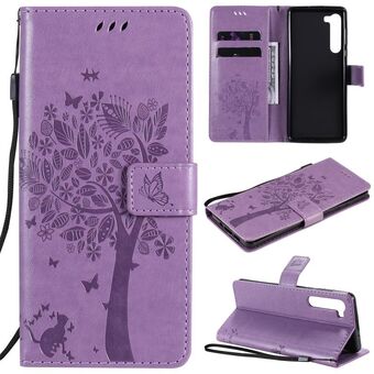 For Motorola Edge Tree & Cat Pattern Pressed Printing Horizontal Flip PU Leather Case with Holder & Card Slots & Wallet & Lanyard(Light Purple)