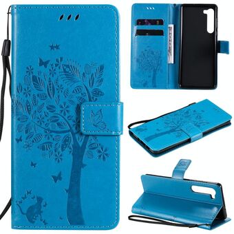 For Motorola Edge Tree & Cat Pattern Pressed Printing Horizontal Flip PU Leather Case with Holder & Card Slots & Wallet & Lanyard(Blue)