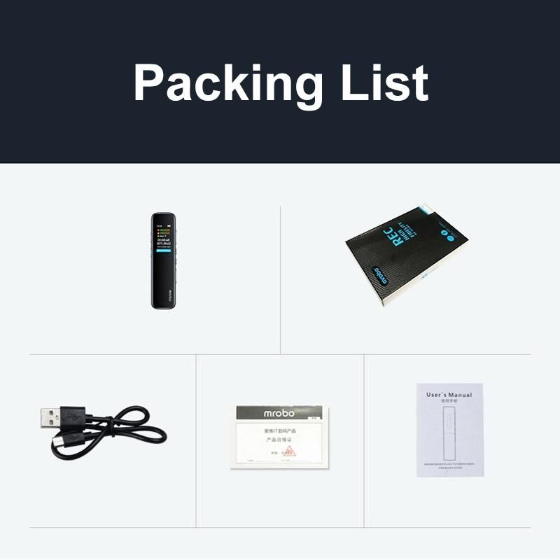 Χαρακτηριστικά: 1. Μικρόφωνο με τρισδιάστατη μείωση θορύβου, εγγραφή 3072K, οκτώ επίπεδα μείωσης θορύβου 2. Υποστήριξη εγγραφής και μεταγραφής εντός εφαρμογής 3. Υποστήριξη σύνδεσης OTG για λήψη στο κινητό τηλέφωνο 4. Προστασία κρυπτογράφησης εγγραφής, μπορείτε να ορίσετε έναν 6ψήφιο κωδικό πρόσβασης. Χωρίς τον κωδικό πρόσβασης, δεν μπορείτε να ενεργοποιήσετε το τηλέφωνο για να προστατεύσετε το περιεχόμενο από διαρροή. 5. Υποστήριξη αναπαραγωγής μουσικής Παράμετροι προϊόντος: 1. Υλικό: κράμα ψευδαργύρου, πλαστικό PC 2. Chip: Actions 3. Υποστηριζόμενες γλώσσες: Απλοποιημένα Κινεζικά, Παραδοσιακά Κινεζικά, Αγγλικά, Γερμανικά, Ιαπωνικά, Κορεατικά, Ισπανικά, Γαλλικά, Αραβικά, Τσεχικά, Ελληνικά, Περσικά, Ιταλικά, Ολλανδικά, Πολωνικά, Πορτογαλικά, Ρωσικά, Φινλανδικά, Σουηδικά, Ταϊλανδικά, Ουγγρικά, Σλοβακικά 4. Χωρητικότητα: 4G/8G/16B/32G/64G/128G 5. Μέγεθος οθόνης: 0,96 ίντσες, έγχρωμη οθόνη TFT 80 x 160 6. Μορφή εγγραφής: WAV, MP3 (ρυθμιζόμενη) 7. Απόσταση εγγραφής: περίπου 5 μέτρα σε ευθεία γραμμή (βέλτιστη) 8. Ρυθμός μετάδοσης: 32kbps, 128kbps, 192kbps, 512kbps (προεπιλογή), 1536kbps, 3072kbps 9. Μορφή μουσικής: MP3/WAV/WMA/APE/FLAC 10. Διεπαφή μετάδοσης: MICRO-5PIN-USB2.0 11. Έξοδος ακουστικών: 3,5MM στερεοφωνικό διπλού καναλιού 12. Προδιαγραφές ακουστικών: υποστηρίζει συνηθισμένα ακουστικά τριών/τεσσάρων τμημάτων, αντίσταση ακουστικών 16 ohms ή 32 ohms 13. Ισχύς εξόδου ακουστικών: 10mW@32 ohm, 20mW@16 ohm 14. Ενσωματωμένη μπαταρία: Πολυμερής μπαταρία λιθίου 3,7V 230mAh 15. Διάρκεια ζωής της μπαταρίας για αναπαραγωγή ήχου: περίπου 25 ώρες για αναπαραγωγή με ακουστικά και 3-7 ώρες για εξωτερική αναπαραγωγή (ανάλογα με την ένταση) 16. Διάρκεια ζωής της μπαταρίας για εγγραφή ήχου: 25 ώρες συνεχούς εγγραφής (η ποιότητα εγγραφής και το επίπεδο μείωσης θορύβου θα διαφέρουν) 17. Χρόνος αποθήκευσης εγγραφής μνήμης 8GB: 64kbps περίπου 360h, 512kbps περίπου 45h, 1536kbps περίπου 15h 18. Τάση φόρτισης: USB 5V 19. Ρεύμα φόρτισης: 300mA-1000mA 20. Χρόνος φόρτισης: περίπου 2-3 ώρες 21. Μέγεθος προϊόντος: 98 x 22 x 9mm 22. Καθαρό βάρος: 65 γραμμάρια Λίστα συσκευασίας: -Συσκευή εγγραφής x 1 -Καλώδιο δεδομένων x 1 -Κάρτα εγγύησης x 1 -Εγχειρίδιο x 1