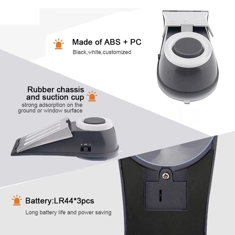 5. Συναγερμός μπλοκαρίσματος πόρτας: κολλήστε την άκρη του προϊόντος στο κενό μεταξύ της πόρτας και του δαπέδου και πιέστε το προϊόν προς τα κάτω για να αφήσετε την βεντούζα και το δάπεδο να απορροφηθούν μαζί. Κάποιος δεν μπορεί να ανοίξει την πόρτα από το εξωτερικό. Όταν κάποιος σπρώξει την πόρτα, Το προϊόν θα εκπέμψει έναν ήχο συναγερμού 125 ντεσιμπέλ με αναβοσβήνει κόκκινη προειδοποιητική λυχνία