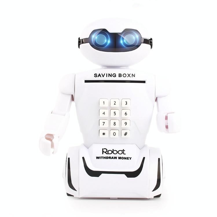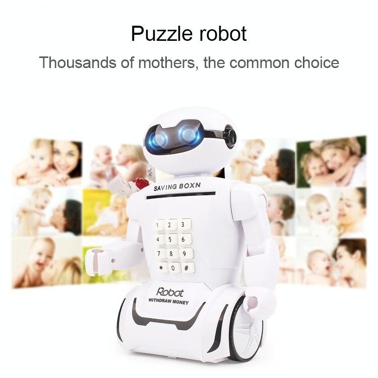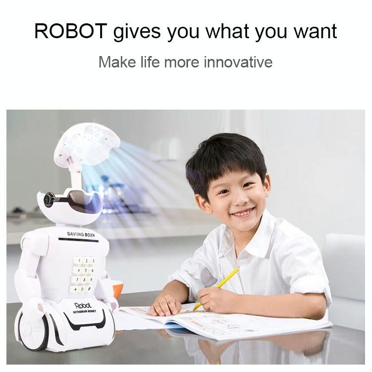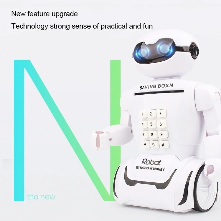 2.Αποθήκευση χρημάτων: βάλτε ένα χαρτονόμισμα στο διάκενο χρημάτων και το μπλε φως αναβοσβήνει, ταυτόχρονα το ρομπότ θα κυλήσει τα χρήματα στο κουτί αυτόματα, στη συνέχεια παίζει τη φωνή της φωνής της εξοικονόμησης χρημάτων στο τέλος.