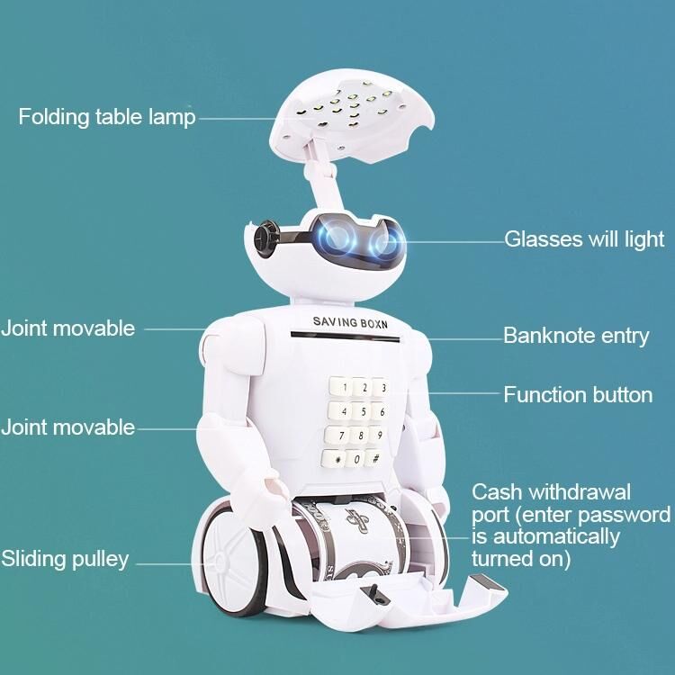 4.Λειτουργία προϊόντος: γυαλιστερά μάτια, αυτόματη κύλιση χρημάτων, μετάδοση μουσικής, κωδικός επαναληπτικότητας, αποθήκευση κερμάτων, συρόμενο ρομπότ, φωτιστικό γραφείου, κινητός βραχίονας.