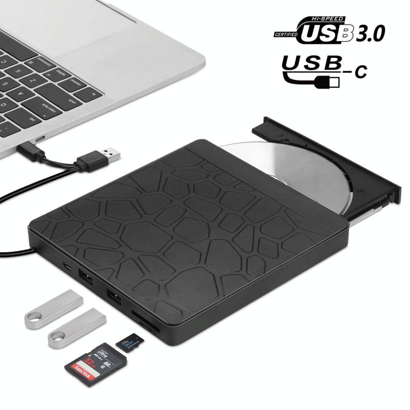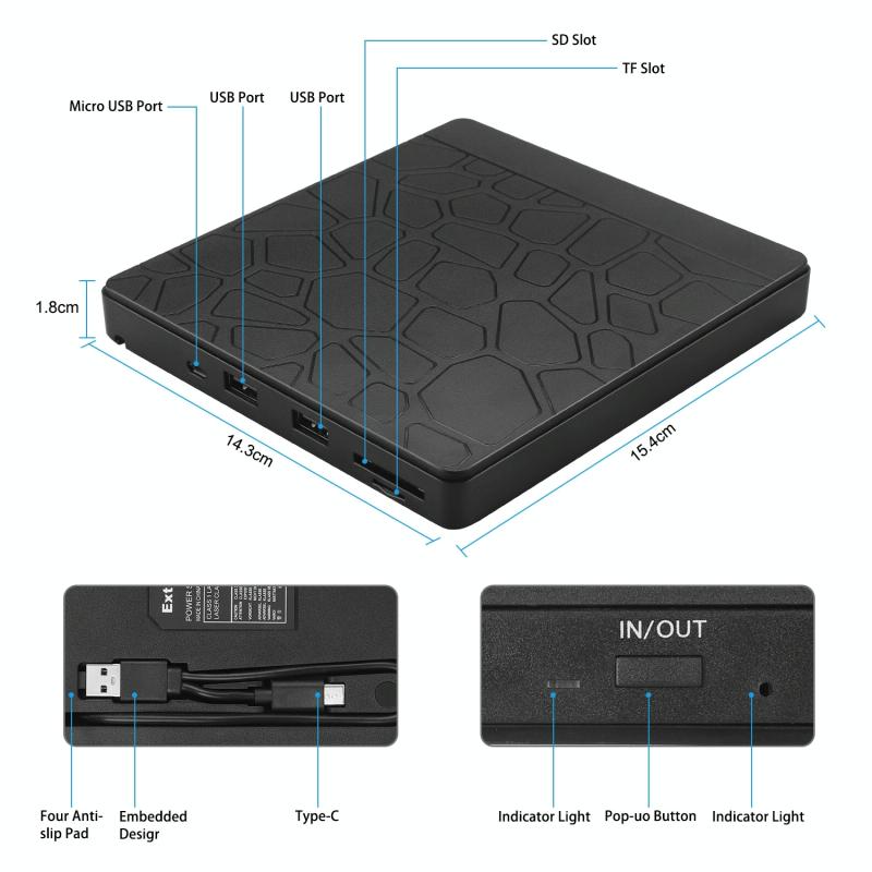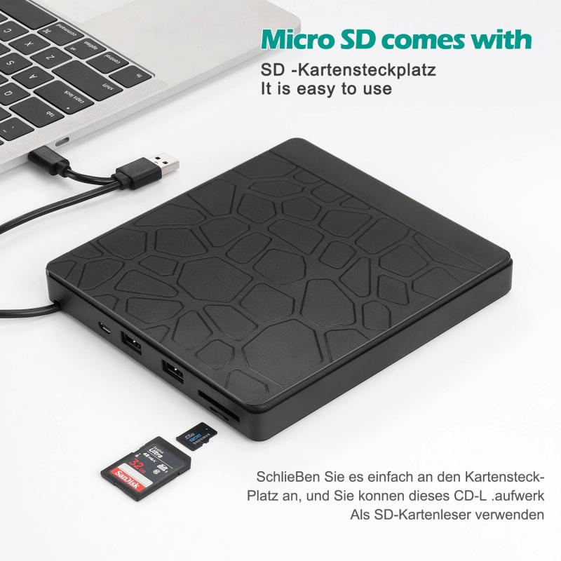 4. Using USB3.0 and Type-C two-in-one cables, you can use USB C DVD drives on different devices. Two standard USB ports ensure fast synchronization and file sharing. Two SD card slots (one Micro SD) are convenient for you to transfer photos or videos taken by the camera from the card to your computer. All the possibilities in the DVD Rom external drive help you to complete your work efficiently! (Note: The U disk and SD card in the picture are not included in the package)