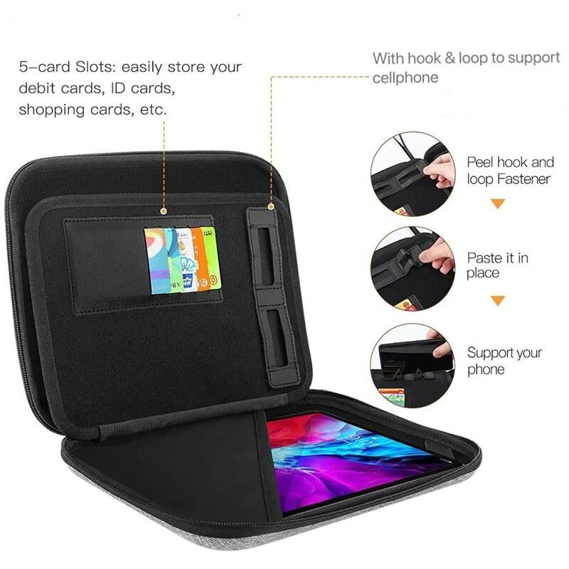 4. A main pockets for placing your tablet. There are elastic mesh slot, open pocket, elastic straps and small pockets for organizing your personal items, such as cellphone, adapter, USB cables, pens, U disk, and little notebooks. 5 card slots for storing your bank cards. A useful hook and loop fastener stand for supporting your cell phone.