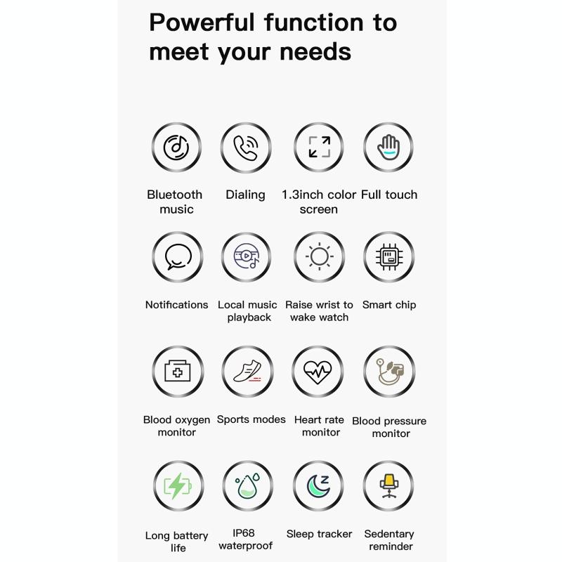 15. Function: bluetooth call, local music playback, music copy storage, connect earphones to play music, step counting, calories, distance, multi-sports mode, sleep monitoring, call reminder, message reminder, sedentary reminder, alarm clock reminder, shake photographing, heart rate monitoring, blood pressure monitoring, blood oxygen monitoring, etc.