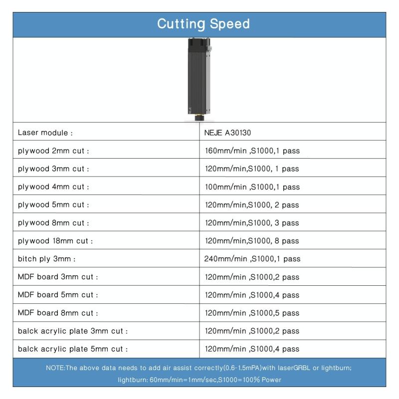 15. Cutting speed(plywood 3mm, with airasist, clear edge): 120mm/min 100% power from 1 pass