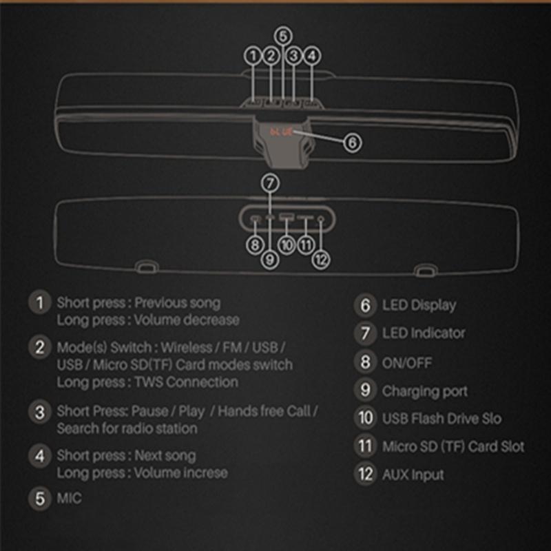 5.Function highly intergrated ,In addition to wireless bluetooth, the Speaker has been highly intergrated; hands-free answering phones,enquiry line,TF card player,AUX input.