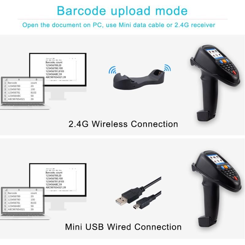 3. Όχι μόνο ένας ασύρματος σαρωτής barcode, αλλά έχει επίσης λειτουργίες συλλογής και αποθήκευσης barcode. Η ενσωματωμένη μνήμη FLASH μπορεί να αποθηκεύσει έως και 50.000 barcode ταυτόχρονα, κάτι που είναι χρήσιμο για τη συλλογή barcode εξοπλισμού γραφείου, απογραφή ρούχων, εισερχόμενη και εξερχόμενη απογραφή και άλλες παρόμοιες εφαρμογές είναι επίσης κατάλληλες. Μέσω της ασύρματης λειτουργίας μαζικής μετάδοσης, τα barcode που συλλέγονται μαζικά μπορούν να μεταφερθούν αυτόματα σε ένα φύλλο Excel ή σε ένα αρχείο κειμένου για την εισαγωγή δεδομένων σε λογισμικό διαχείρισης.