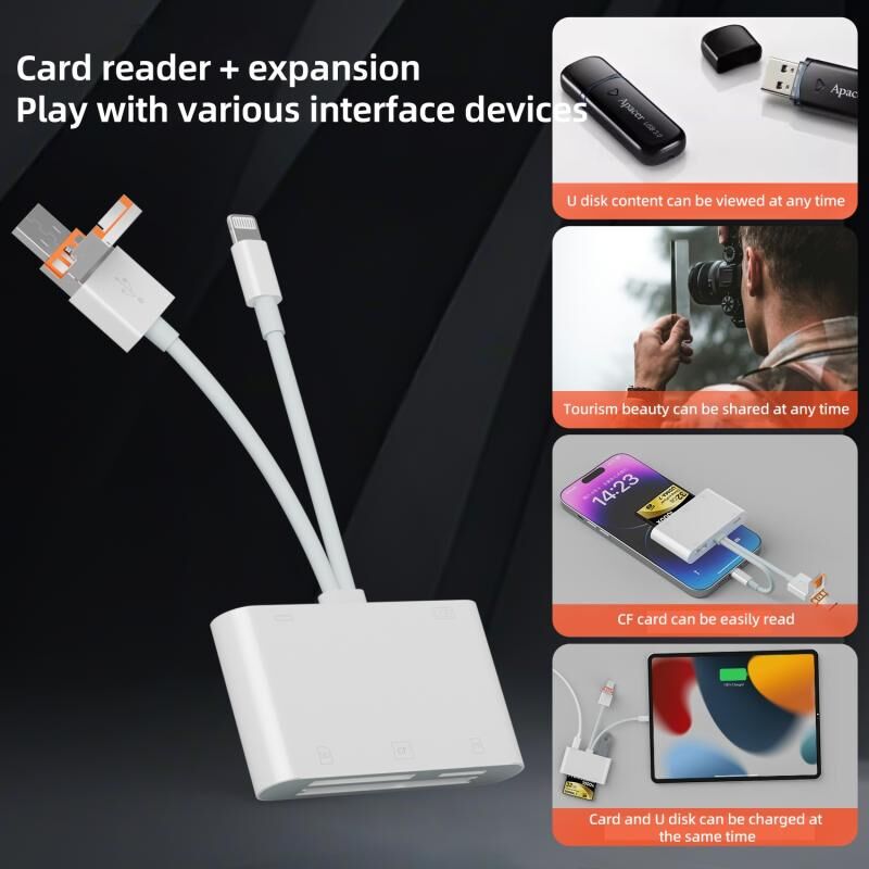 The Type-C/8 Pin/USB-A card reader adapter is a multifunctional accessory specially developed for the problem that it is too cumbersome to import photos from digital cameras to devices. By using the adapters Type-C interface, USB interface and CF/TF/SD card slot, the digital camera can directly import photos to the device using a data cable and converter. It can also be used to expand the USB flash drive with the lowest power consumption. At the same time, the Type-C interface can charge devices with 8 Pin interface and Type-C interface.