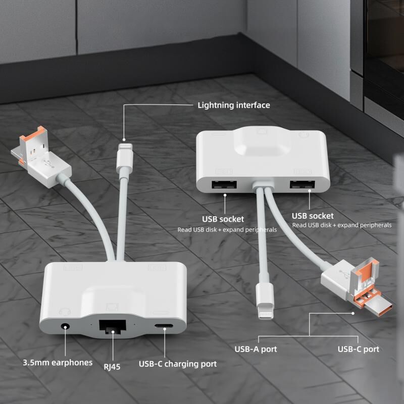 Type-C/8 Pin/USB-A multi-function adapter, through the RJ45 interface, can connect Type-C/8 Pin/USB-A interface devices to Ethernet, so as to achieve continuous and fast Internet access. When surfing the Internet, use the 3.5mm audio socket to play the sound outward to experience a different feeling. Use the USB and Type-C sockets to import photos directly from the digital camera to the device with a data cable and converter. It can also expand the device with the lowest power consumption USB flash drive, keyboard or use 3.5mm headphones while charging the device.