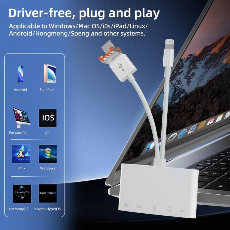 Type-C/8 Pin/USB-A multi-function adapter, using Micro USB female socket, SD/TF card slot can transfer data for three different interface devices, and can charge devices at the same time through Type-C interface and 8 Pin interface.