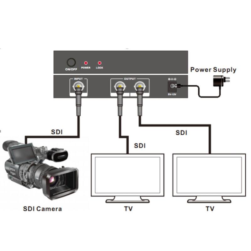 1 x 2 SDI splitter distributes allows 1 SDI, HD-SDI or 3G-SDI video source to 2 SDI/HD-SDI/3G-SDI displays simultaneously. This product built-in automatic identification and compatible with SD-SDI, HD-SDI, 3G-SDI all format of SDI signal. It is the support 2.97Gbps bandwidth, and supports lossless transmission over long distances.