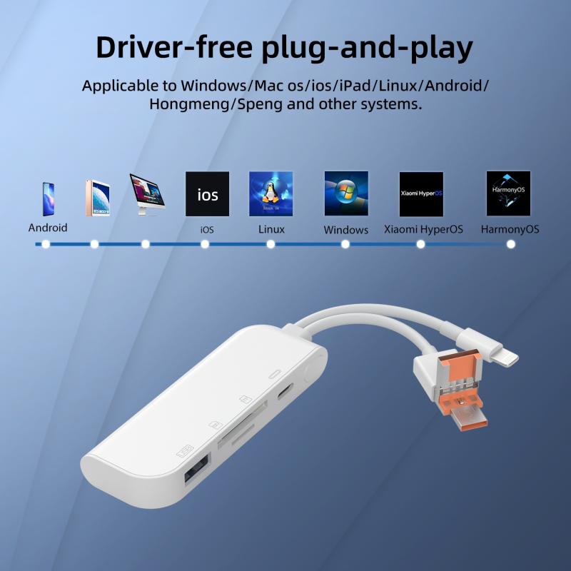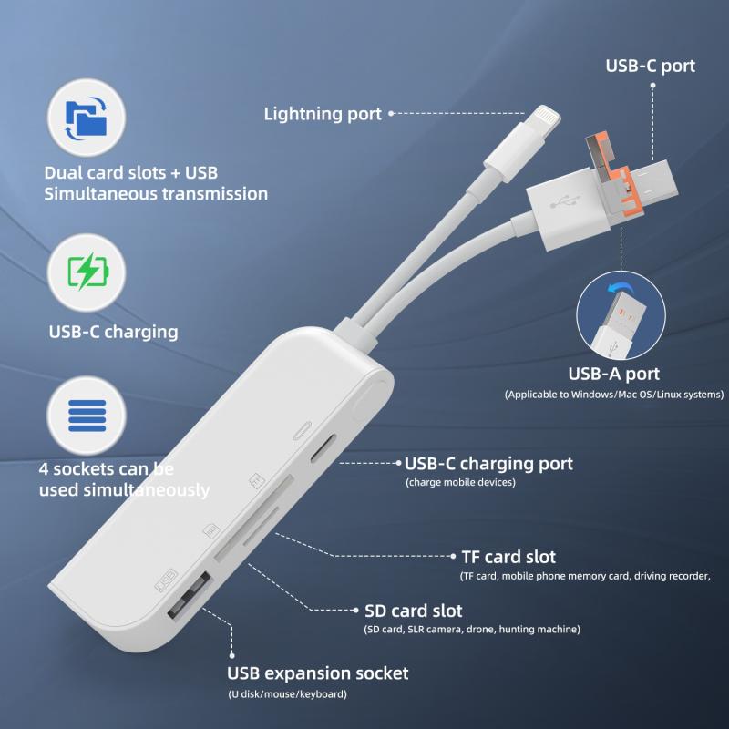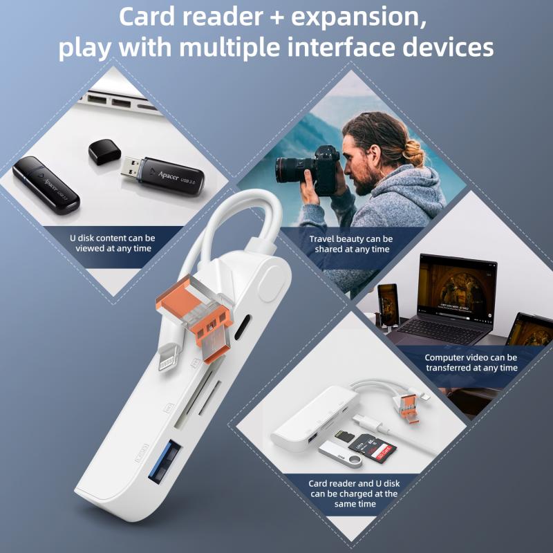 The Type-C/USB-A/USB-C multi-function adapter is a multi-function converter specially developed for the problem that it is too cumbersome to import photos from digital cameras to devices. By using the USB female socket, CF/SD/TF card slot and USB-C female socket of the adapter, the digital camera can directly import photos to the device using a data cable and a converter. It can also expand the device with a low-power USB flash drive. At the same time, the USB-C female socket can charge devices with 8-pin interfaces and USB-C interfaces.