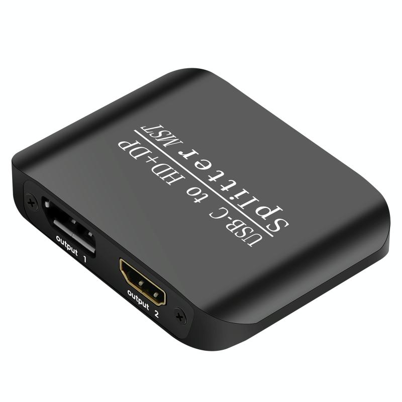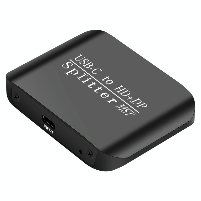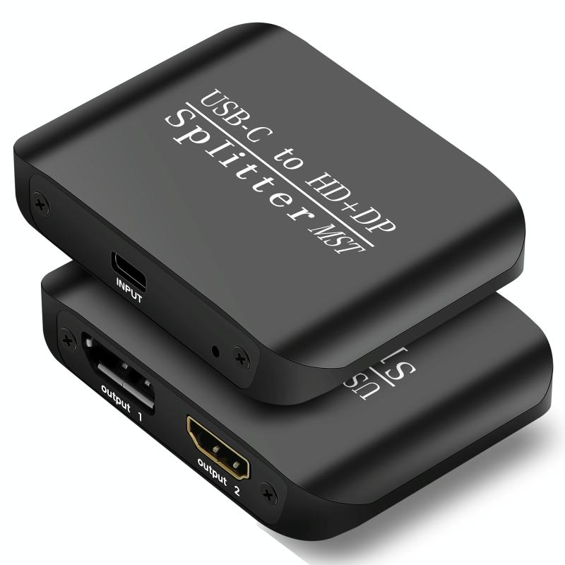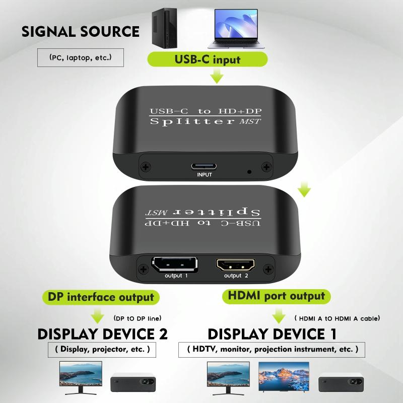 1. USB C to Dual DisplayPort Expansion: This USB C to DisplayPort adapter connects to the USB C output port of devices like laptops, allowing for the addition of two screens