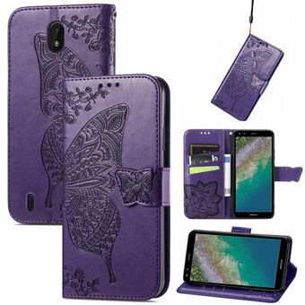 Butterfly Love Flowers Embossed Horizontal Flip Leather Case with Holder & Card Slots & Wallet & Lanyard For Nokia C01 Plus(Dark Purple)