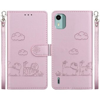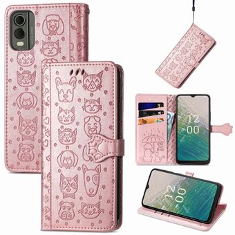 For Nokia C32 Cat and Dog Embossed Leather Phone Case(Rose Gold)