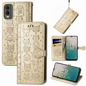 For Nokia C32 Cat and Dog Embossed Leather Phone Case(Gold)