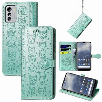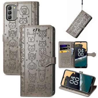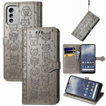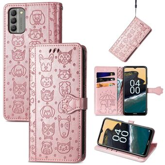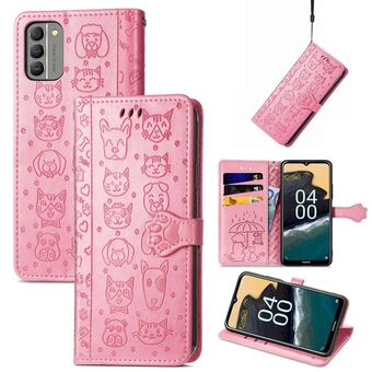 Θήκη τηλεφώνου από δέρμα με ανάγλυφα σχέδια γατιού και σκύλου για Nokia G60 (Μωβ)