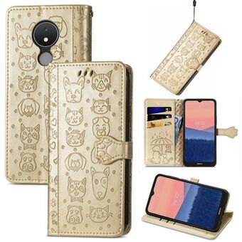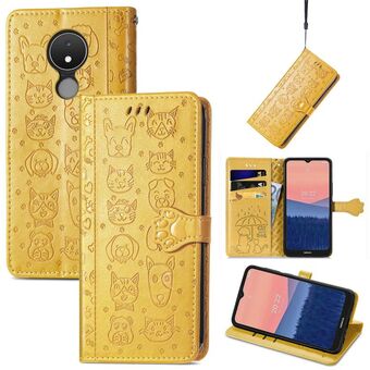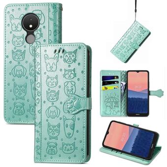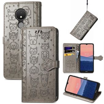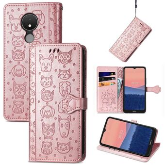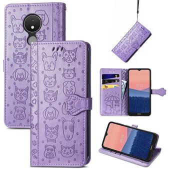 Θήκη τηλεφώνου από δέρμα με ανάγλυφα σχέδια χαριτωμένων γάτας και σκύλου για Nokia C21 (Μωβ)