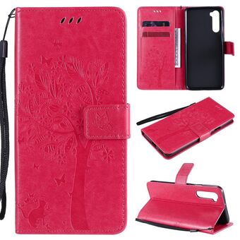 For OnePlus Nord Tree & Cat Pattern Pressed Printing Horizontal Flip PU Leather Case with Holder & Card Slots & Wallet & Lanyard(Rose Red)